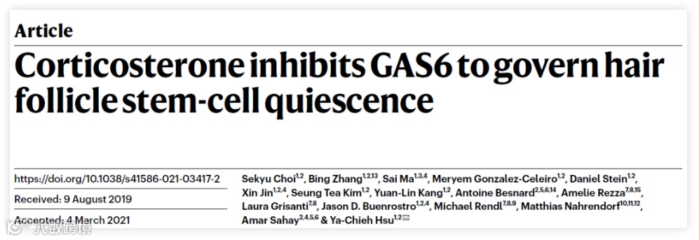 2021年3月31日,许雅捷研究组再发Nature 文章,题为Corticosterone inhibits GAS6 to govern hair follicle stem-cell quiescence,揭开了长期慢性压力影响毛囊干细胞行为和抑制毛发生长的具体机制。