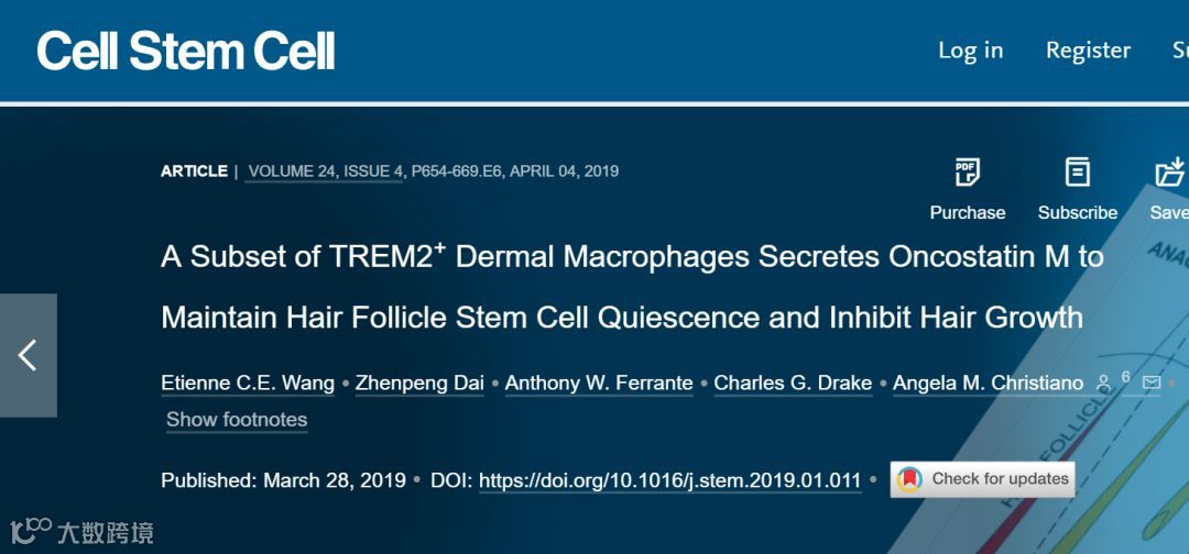 Etienne C.E. Wang et al. A Subset of TREM2+ Dermal Macrophages Secretes Oncostatin M to Maintain Hair Follicle Stem Cell Quiescence and Inhibit Hair Growth, Cell Stem Cell (2019).