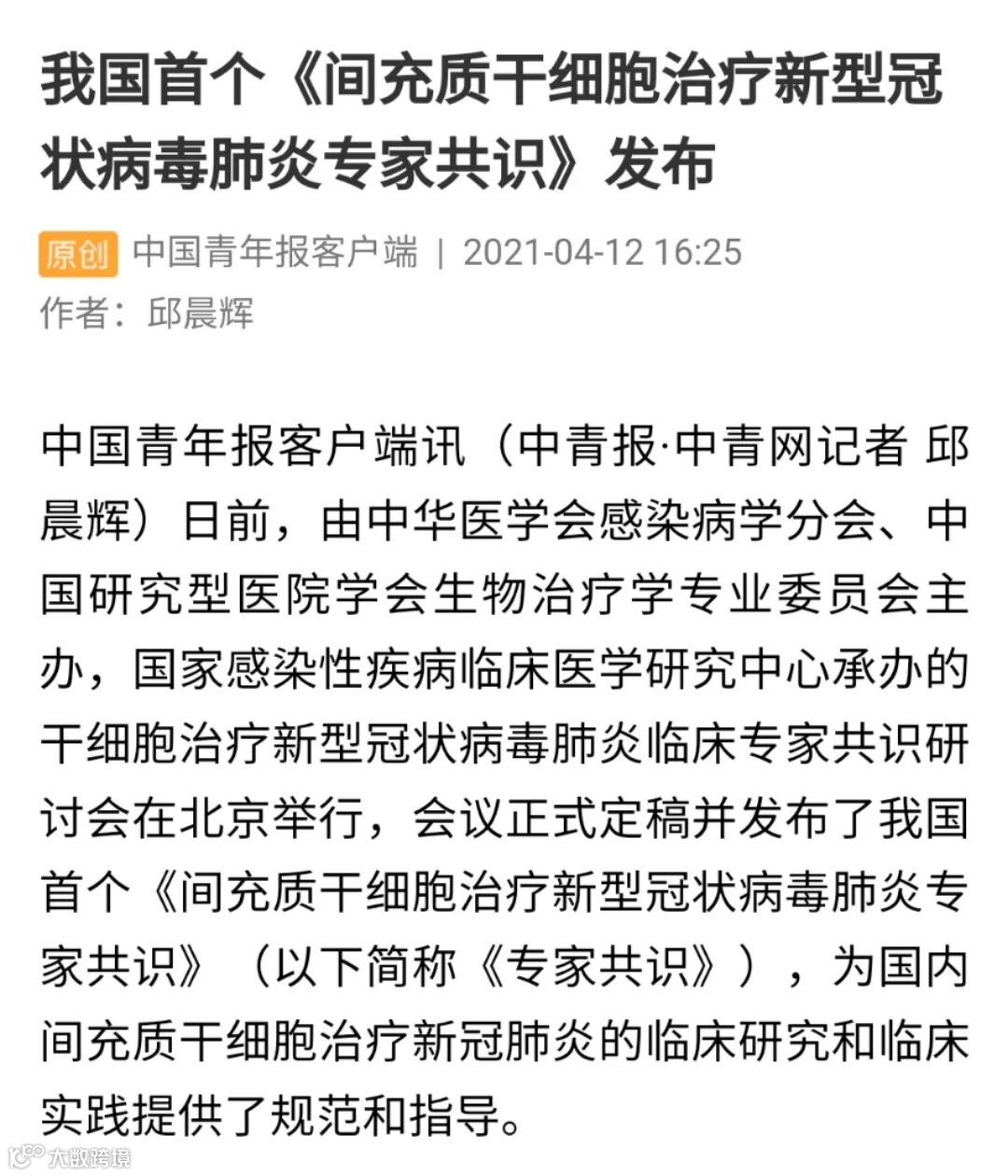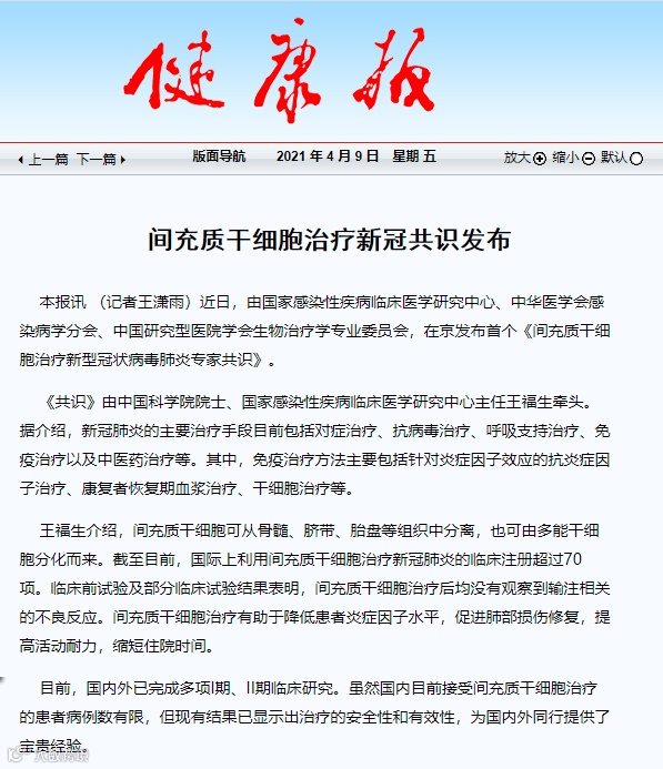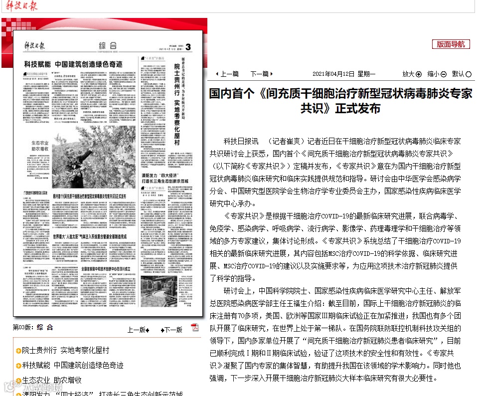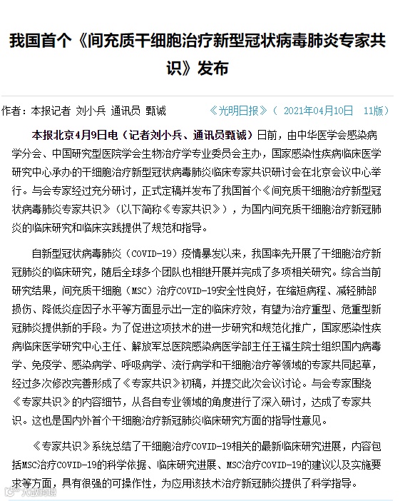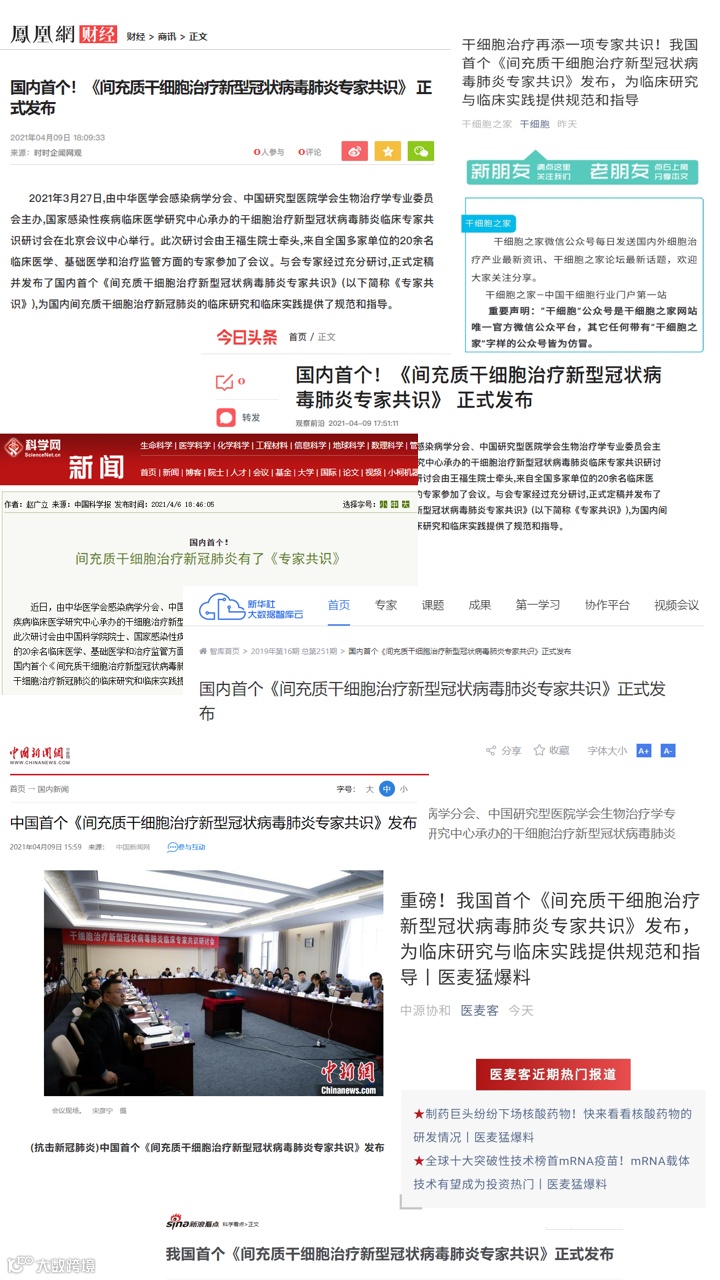 《专家共识》系统总结了干细胞治疗COVID-19相关的最新临床研究进展,内容包括MSC治疗COVID-19的科学依据、临床研究进展、MSC治疗COVID-19的建议以及实施要求等方面,具有很强的可操作性,为应用该技术治疗新冠肺炎提供了科学指导。《专家共识》一经发布便吸引了众多主流媒体及行业权威媒体关注与详细报道,纷纷肯定《专家共识》在间充质干细胞在治疗新冠肺炎方面的规范与指导意义。