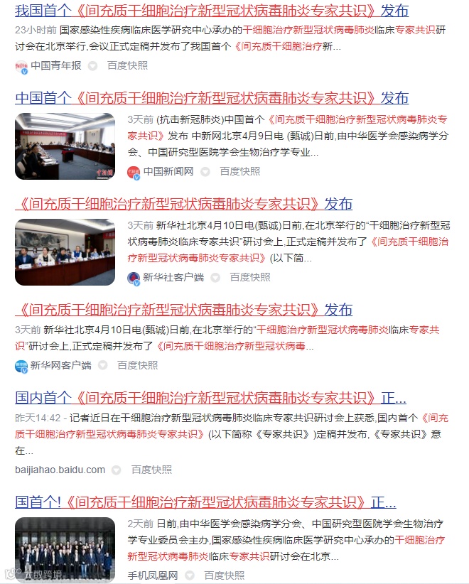 截至目前,新华社、光明日报、健康报、科技日报、中国青年报、中国新闻网、中国科学报、科学网、医麦客、干细胞者说、凤凰网、今日头条、网易、新浪、搜狐、腾讯新闻、百度新闻等主流媒体及行业权威媒体集中重磅报道,相关新闻报道仍在不断发布中。