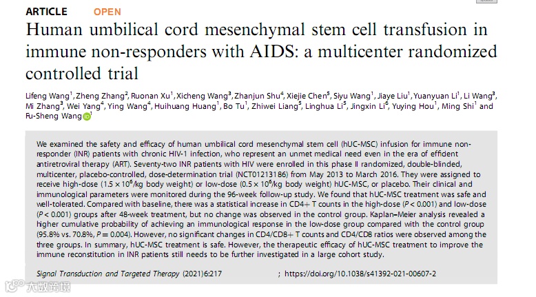 近日,中国人民解放军总医院院士团队在 Signal Transduction and Targeted Therapy 上在线发表了一篇研究论文《Human umbilical cord mesenchymal stem cell transfusion in immune non-responders with AIDS: a multicenter randomized controlled trial》。研究发现:脐带间充质干细胞能够帮助艾滋病患者免疫重建,且安全可靠!