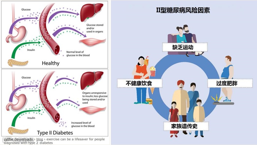 2 型糖尿病( Type 2 diabetes mellitus ,T2DM),通常是由过度肥胖、缺乏运动、不健康的饮食和家族遗传等因素造成的。当肝脏、肌肉和脂肪组织中的细胞对胰岛素的刺激不敏感,导致葡萄糖摄取失败时,胰岛素抵抗就出现了。