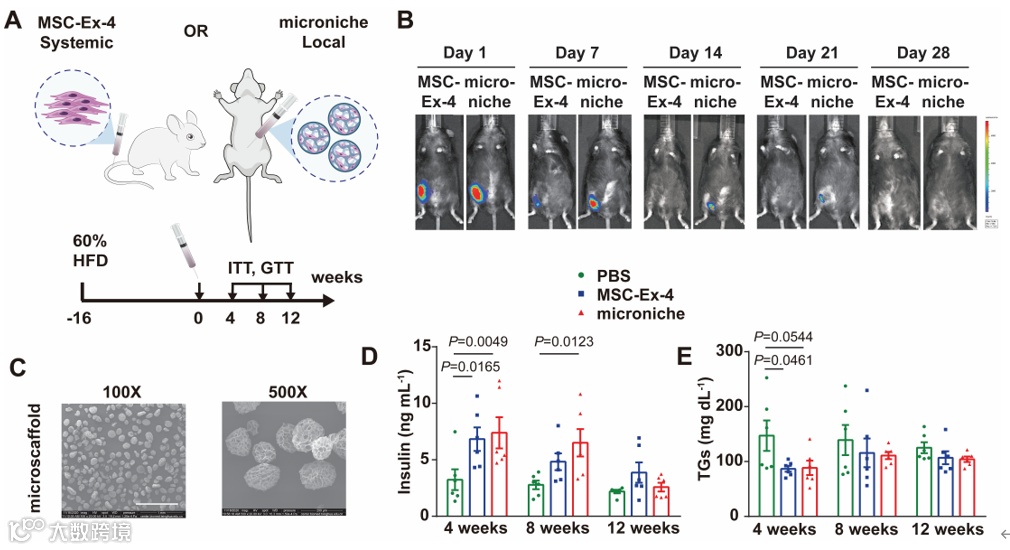 动物实验表明,利用3DTableTrix®微载体对MSC-Ex-4细胞进行包裹和体内递送,显著延长MSC-Ex-4在体内的存活时间且增强糖尿病治疗效果。MSC-Ex-4联合3D明胶微支架局部注射治疗,可延长MSC-Ex-4存活时间至一个月,治疗效果至两个月以上。