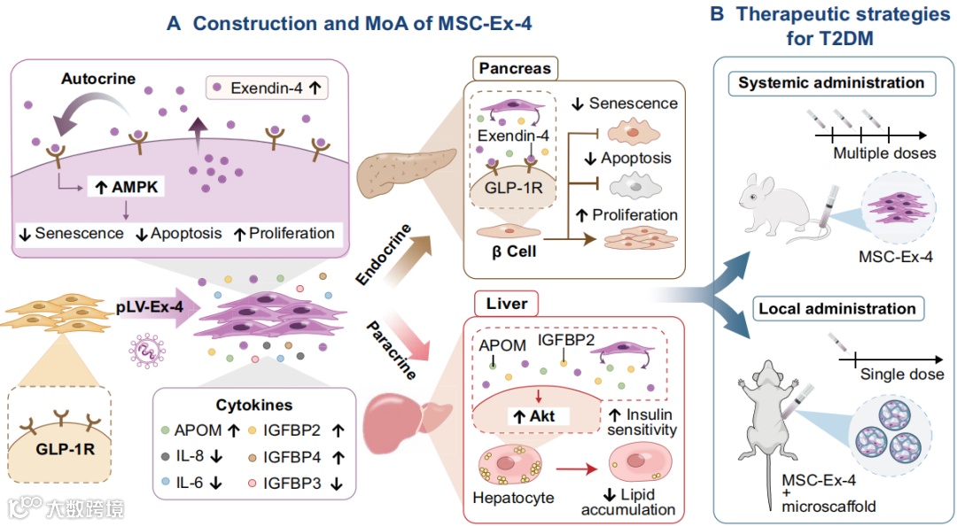 近日,清华大学医学院杜亚楠课题组研究团队报道了一项研究成果,对间充质干细胞进行基因(Exendin-4)修饰获得MSC-Ex-4,可提高自身在高糖下的存活并显著增强对2型糖尿病的治疗效果。使用3D微载体进行体内递送,实现小鼠皮下注射存活时间达一个月,增强糖尿病治疗效果达到两个月以上。这项研究发表在Science Advances上,题目如下: Exendin-4 gene modification and microscaffold encapsulation promote self-persistence and antidiabetic activity of MSCs