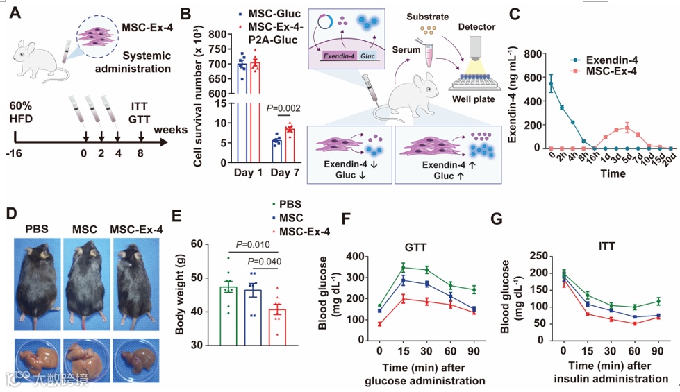 动物实验表明,MSC-Ex-4明显缓解小鼠2型糖尿病症状。经MSC-Ex-4注射一周后,细胞在小鼠体内存活数量显著高于对照组,同时Exendin-4达峰时间显著延长。小鼠代谢表型显著改善。