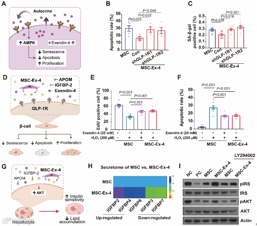 体外实验证明,MSC-Ex-4在高糖环境下抗凋亡和抗衰老能力增强,细胞内AMPK信号通路被激活。同时MSC-Ex-4可促进胰岛细胞增殖和抑制凋亡,并通过分泌因子激活肝脏细胞PI3K-AKT信号通路。