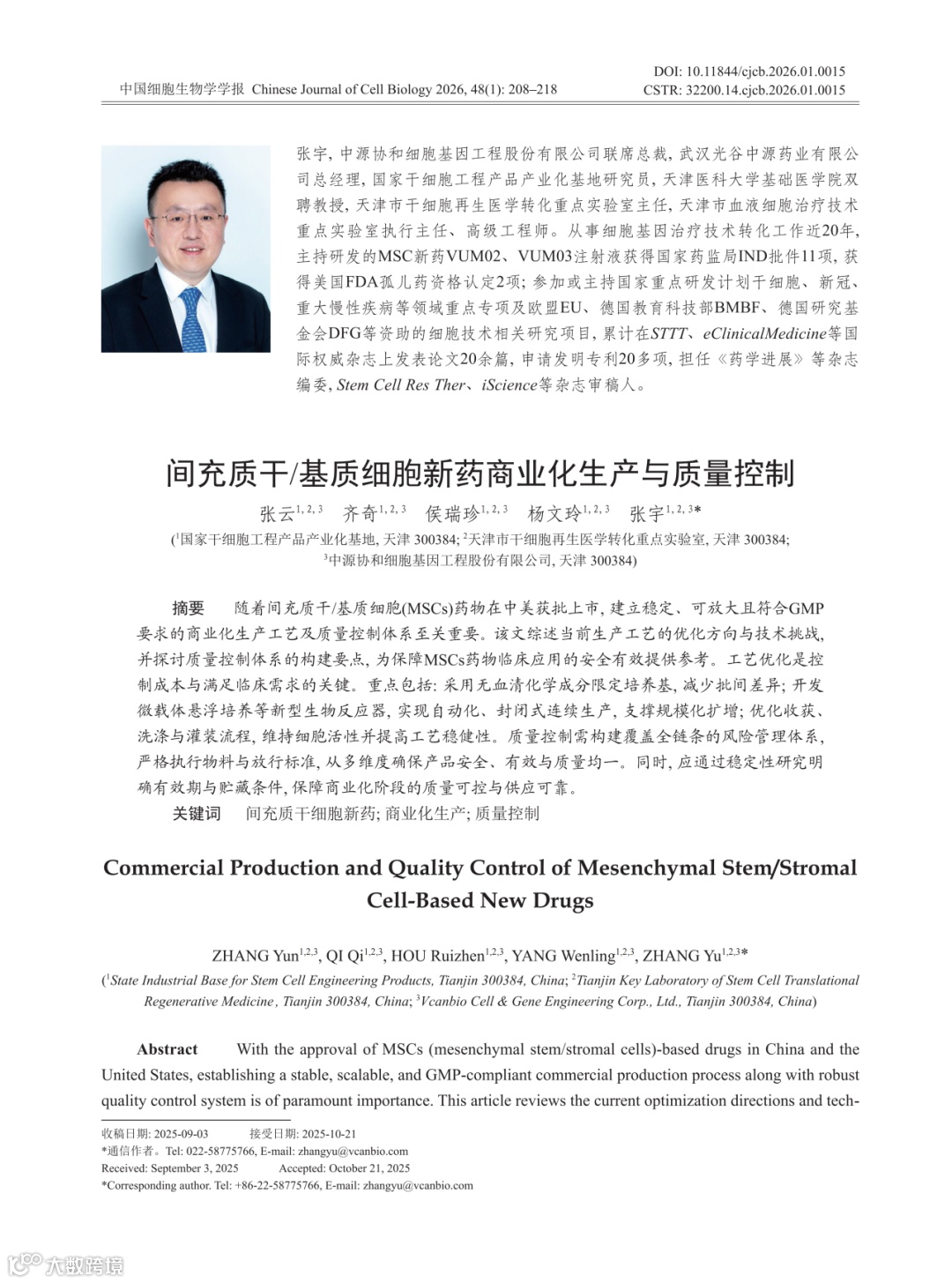 2026年1月,中源协和团队在核心期刊《中国细胞生物学学报》细胞与基因治疗转化研究专刊上,发表题为《间充质干/基质细胞新药商业化生产与质量控制》文章。该文综述当前生产工艺的优化方向与技术挑战,并探讨质量控制体系的构建要点, 为保障MSCs药物临床应用的安全有效提供参考。