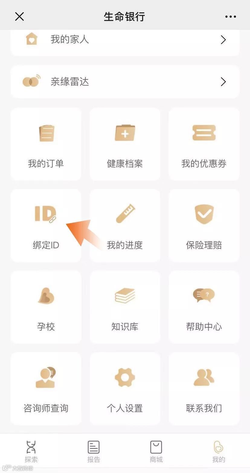 2、点击右下角“我的”,进入后请先确认是否已绑定新生儿合同,若无绑定,请先在“绑定ID”中绑定新生儿合同,这是储户办理在线业务的前提,绑定后再进行以下步骤的操作。