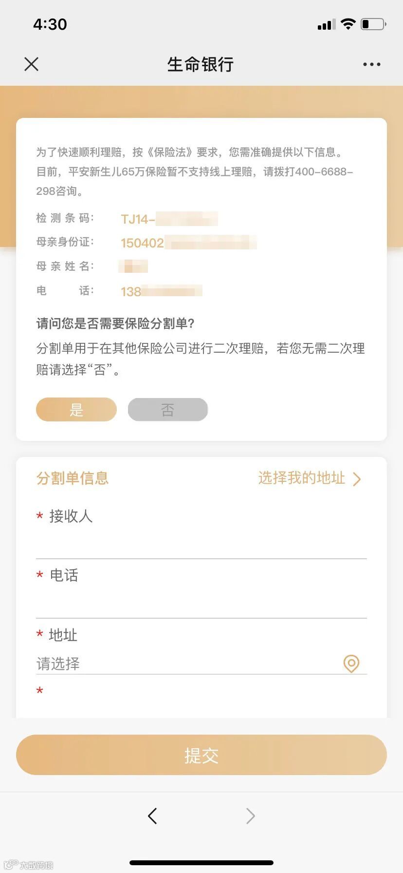 已提交至保险公司 — 资料已递交至保险公司,自此至打款大概3个月时间