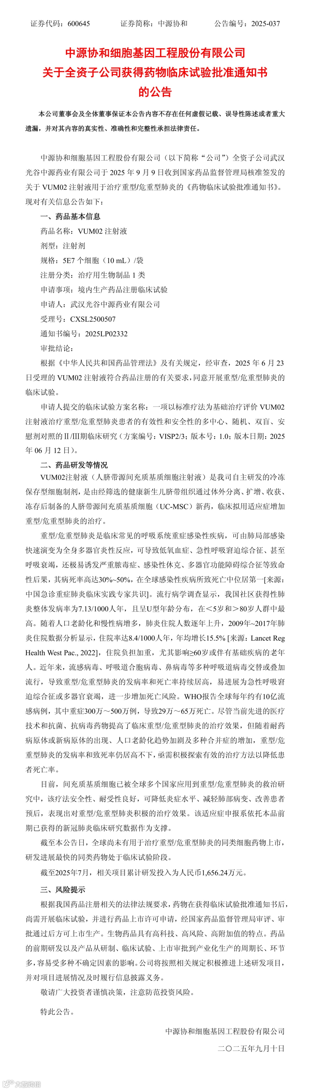 中源协和细胞基因工程股份有限公司(以下简称“公司”)全资子公司武汉光谷中源药业有限公司于 2025年9月9日收到国家药品监督管理局核准签发的关于VUM02注射液用于治疗重型/危重型肺炎的《药物临床试验批准通知书》。现对有关信息公告如下: