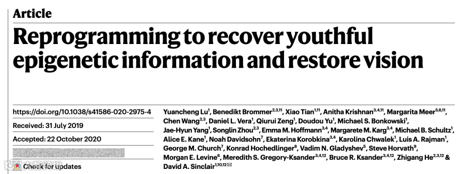 2020年12月3日,哈佛大学医学院David Sinclair团队的吕垣澄博士与何志刚及Bruce Ksander等团队合作在Nature上发表了题为Reprogramming to recover youthful epigenetic information and restore vision的封面文章。该研究利用基因治疗诱导神经节细胞重编程,恢复年轻的表观遗传信息,从而使得视神经能在损伤后再生,并逆转青光眼和衰老造成的视力下降。