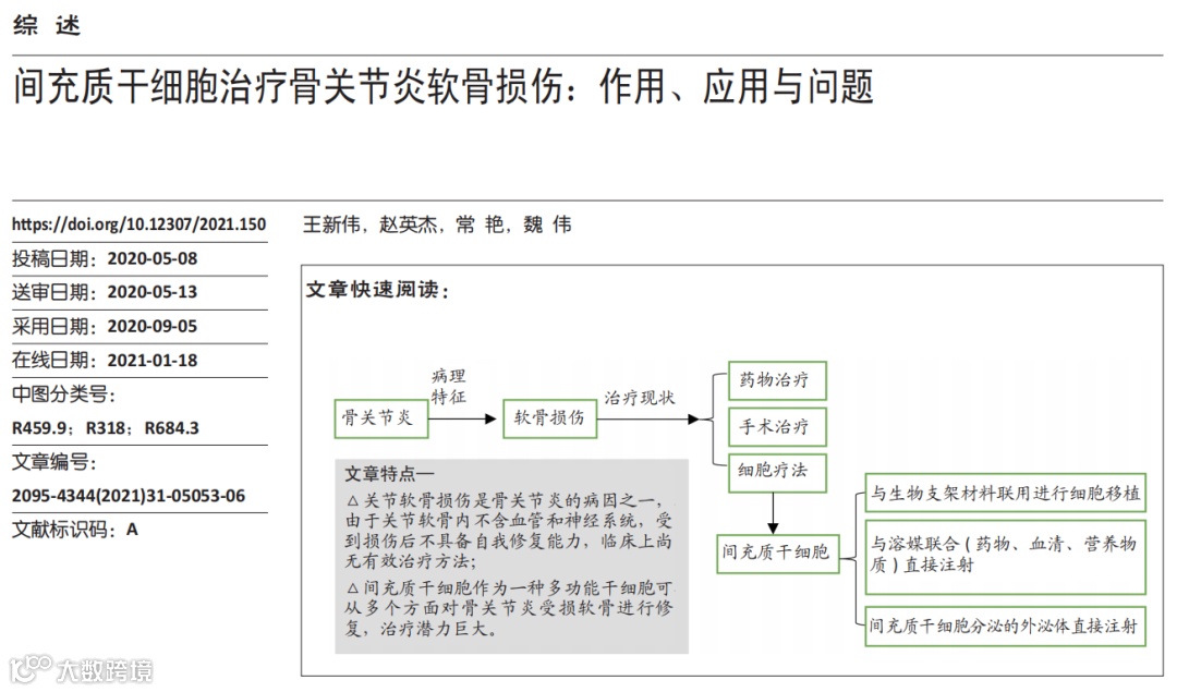 间充质干细胞可实现关节软骨再生,为治疗骨关节炎软骨损伤提供了新的选择。