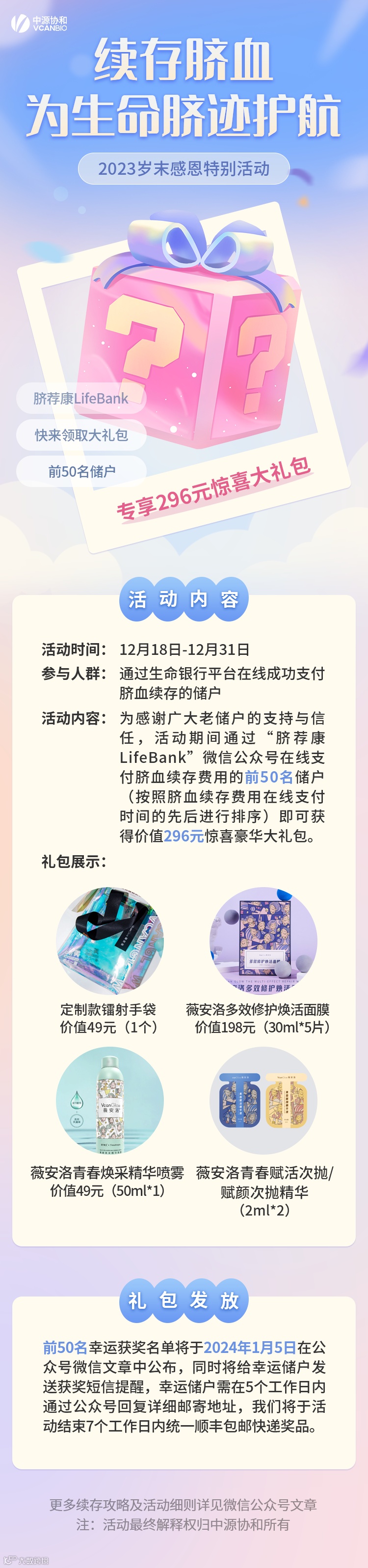 注意:本次大礼包仅限活动期间前50名在线支付脐血续存费用的储户,具体名单以公众号2024年1月5日公布为准;另中奖后,若活动期间产生退款行为,则该奖项自动作废。