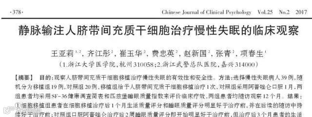 2017年,发表在《中国临床心理学》杂志的一项临床观察成果显示,静脉输注脐带间充质干细胞可长期改善慢性失眠患者的睡眠质量。