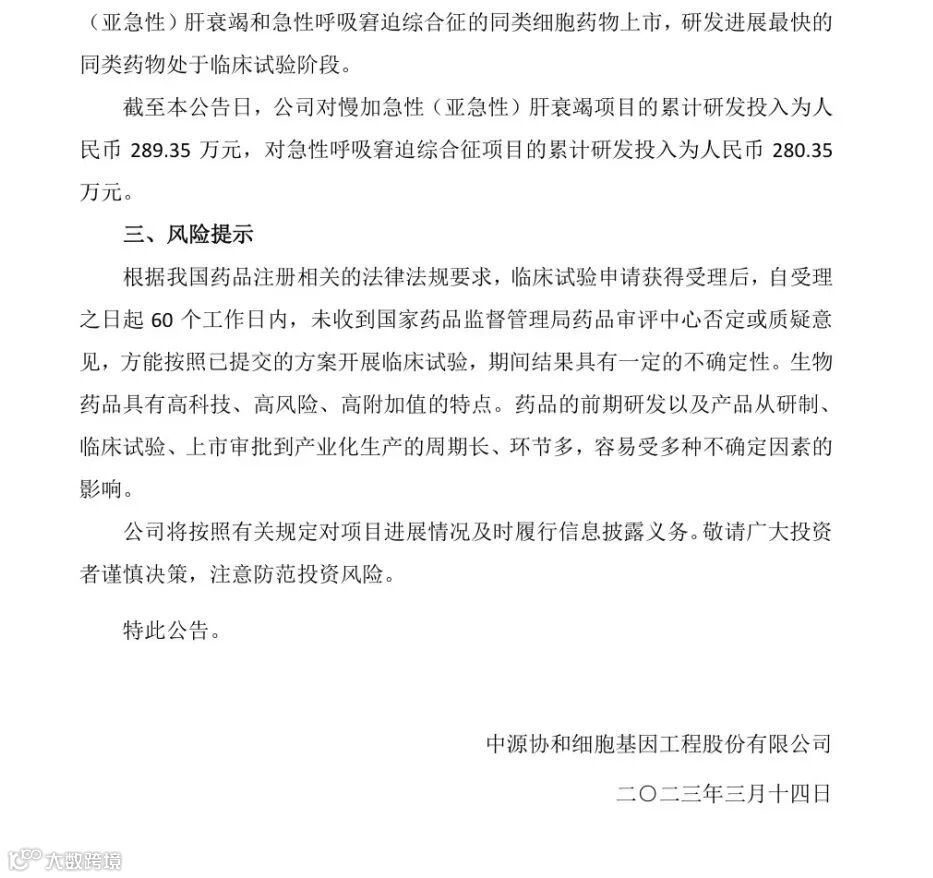 截至本公告日,公司对慢加急性(亚急性)肝衰竭项目的累计研发投入为人民币 289.35万元,对急性呼吸窘迫综合征项目的累计研发投入为人民币 280.35万元。