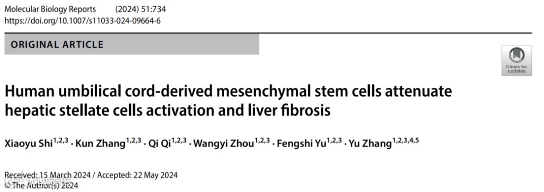 近日,国际权威学术期刊Molecular Biology Reports在线发表了题为“Human umbilical cord-derived mesenchymal stem cells attenuate hepatic stellate cells activation and liver fibrosis”的研究论文,该论文通讯作者为中源协和首席科学官张宇博士及其带领的研发团队,本文证实了中源协和生产的间充质干细胞新药VUM02注射液及其条件培养基在体外和体内显著抑制肝星状细胞的活化从而抑制肝纤维化的治疗效果。