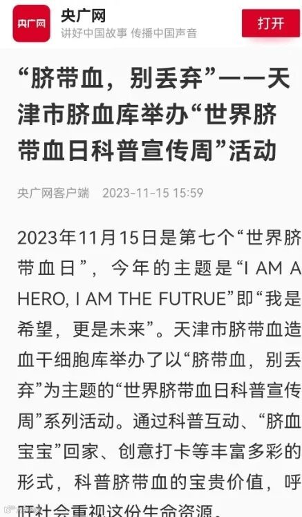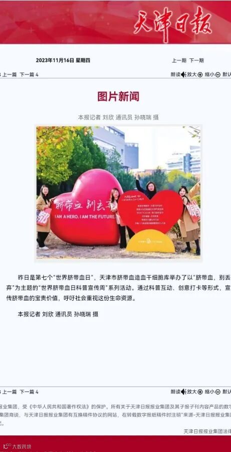 第七个“世界脐带血日”期间,天津市脐带血造血干细胞库举行了以“脐带血,别丢弃”为主题的“世界脐带血日科普宣传周”系列活动,通过 “科普宣传官”city walk、创意街景打卡、脐血宝宝回家等形式科普脐带血价值,呼吁社会珍惜宝贵的生命资源。
