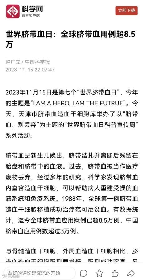 脐带血是胎儿娩出、脐带结扎并断离后残留在脐带和胎盘中的血液。目前,脐带血造血干细胞已应用于血液系统、免疫系统等80多种疾病。全球脐带血应用案例已超8.5万例,中国脐带血应用例数超过3万例。