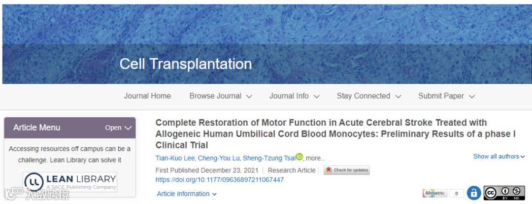 2021年中国台湾花莲慈济大学医学院报道了一个案例:一名缺血性脑卒中偏瘫患者参加了慈济大学医学院的邱琮朗主任等人开展的一项I期临床研究,使用脐血单核细胞治疗急性脑卒中。在治疗后12个月内取得完全康复,结果发表在Cell Transplantation(细胞移植)期刊上。