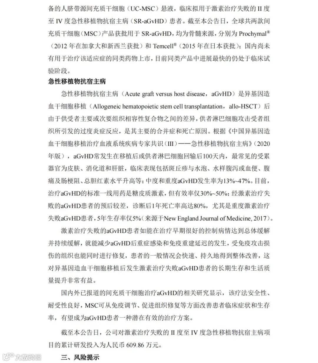 VUM02注射液(人脐带源间充质干细胞注射液)是我司自主研发的冷冻保存型干细胞制剂,是由健康新生儿脐带组织经体外分离、筛选、扩增、冻存后制备的人脐带源间充质干细胞(UC-MSC)悬液,临床拟用于激素治疗失败的II度至IV度急性移植物抗宿主病(SR-aGvHD)患者。截至本公告日,全球共两款间充质干细胞(MSC)产品获批用于SR-aGvHD,均为骨髓来源,分别为Prochymal®(2012年在加拿大和新西兰获批)和Temcell®(2015年在日本获批);国内尚未有用于治疗该适应症的同类药物上市,目前同类产品中进展最快的仍处于临床试验阶段。