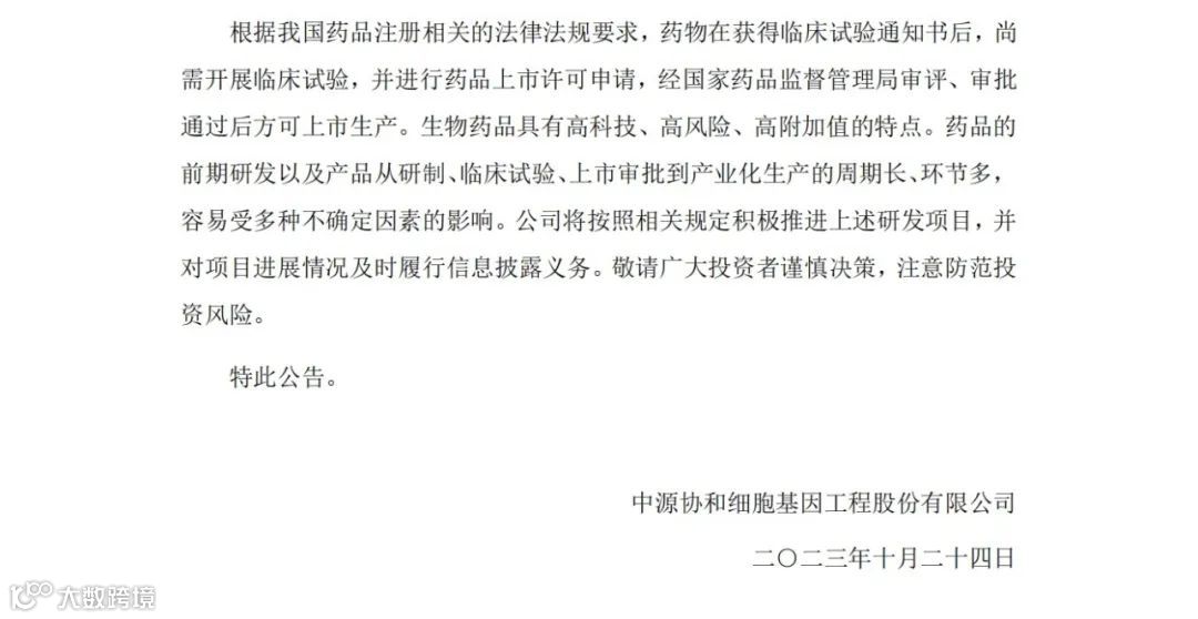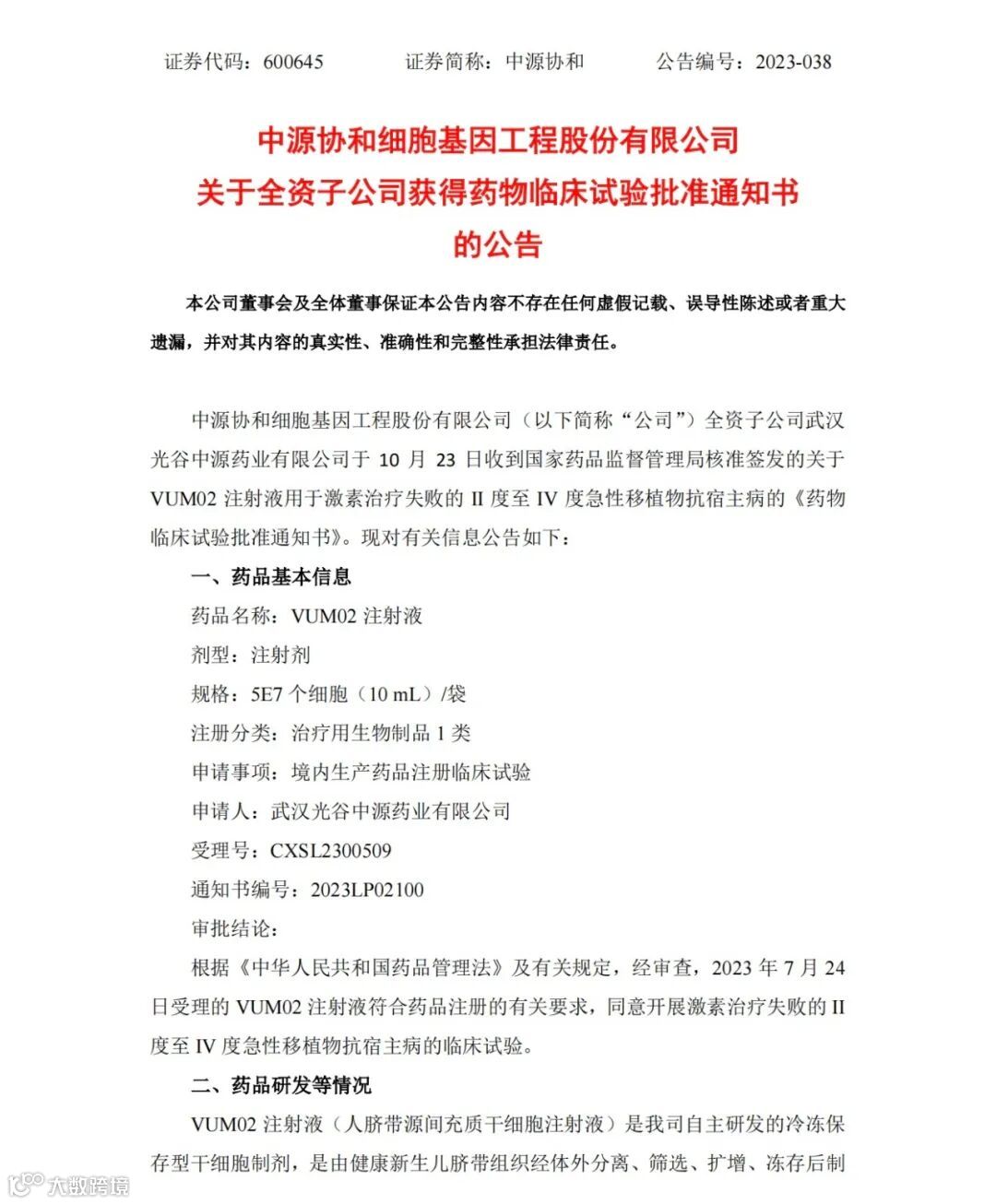 中源协和细胞基因工程股份有限公司(以下简称“公司”)全资子公司武汉光谷中源药业有限公司于10月23日收到国家药品监督管理局核准签发的关于VUM02注射液用于激素治疗失败的II度至IV度急性移植物抗宿主病的《药物临床试验批准通知书》。现对有关信息公告如下: