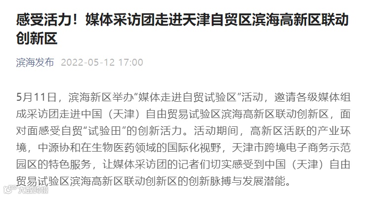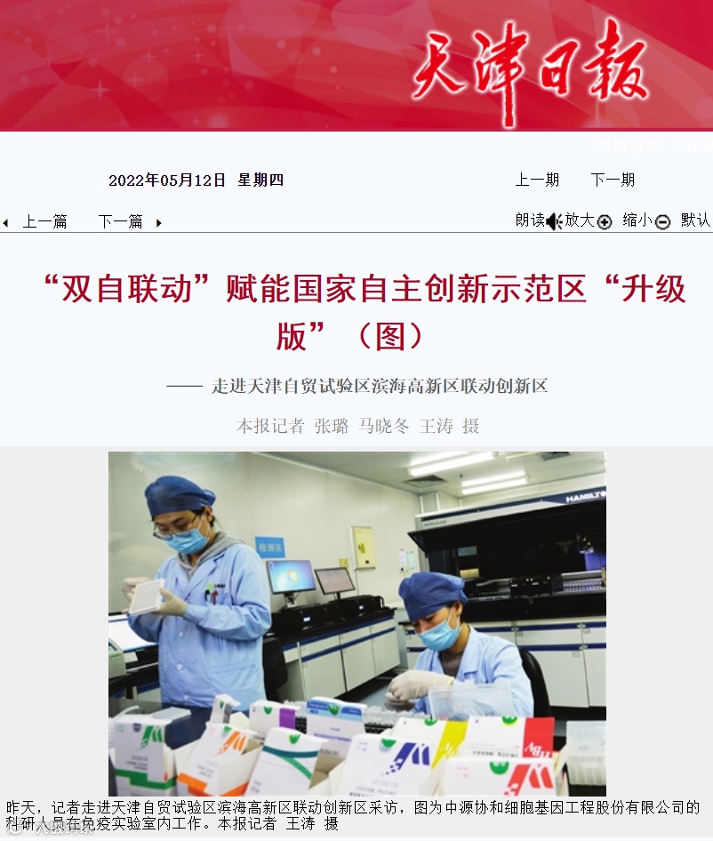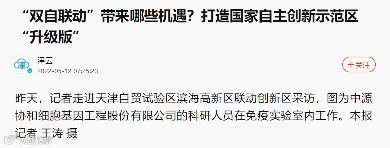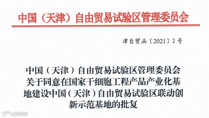 2021年6月,天津自贸试验区管理委员会正式批复在国家干细胞工程产品产业化基地建设中国(天津)自由贸易试验区联动创新示范基地,以中国医学科学院血液病医院(血液学研究所)、中源协和细胞基因工程股份有限公司、合源生物科技(天津)有限公司、天津和创生物技术有限公司为主体,探索开展基因与细胞治疗试点。