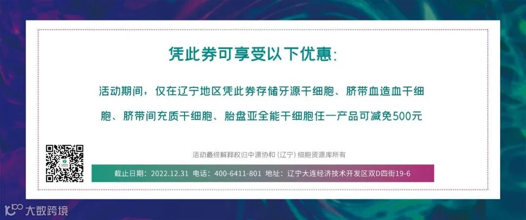 凡获得500元抵值券的客户,在2022年12月31日之前存储牙源干细胞、脐带血造血干细胞、脐带间充质干细胞、胎盘亚全能干细胞任一种可减免500元!抵值券仅在辽宁地区使用一次!