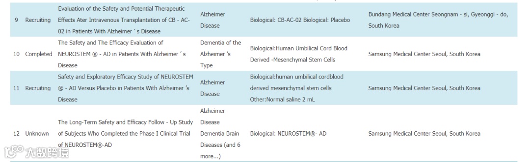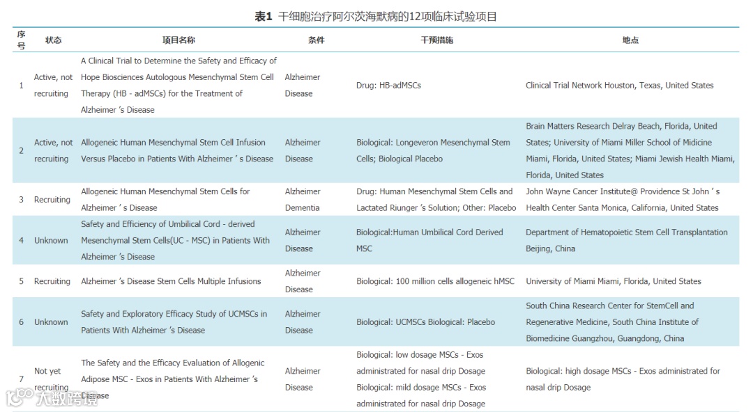 表1干细胞治疗阿尔茨海默病的12项临床试验项目