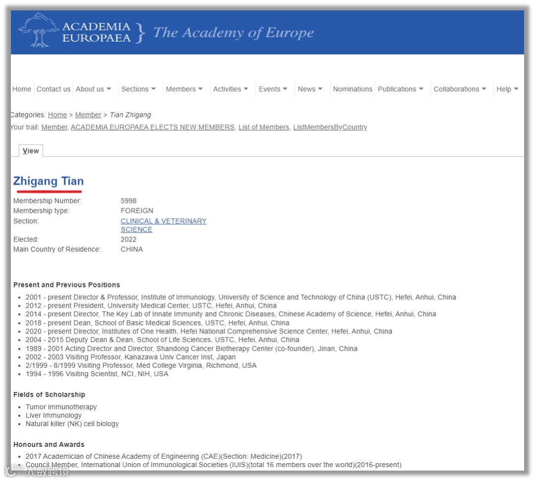 田志刚院士当选欧洲科学院院士网站截图▲