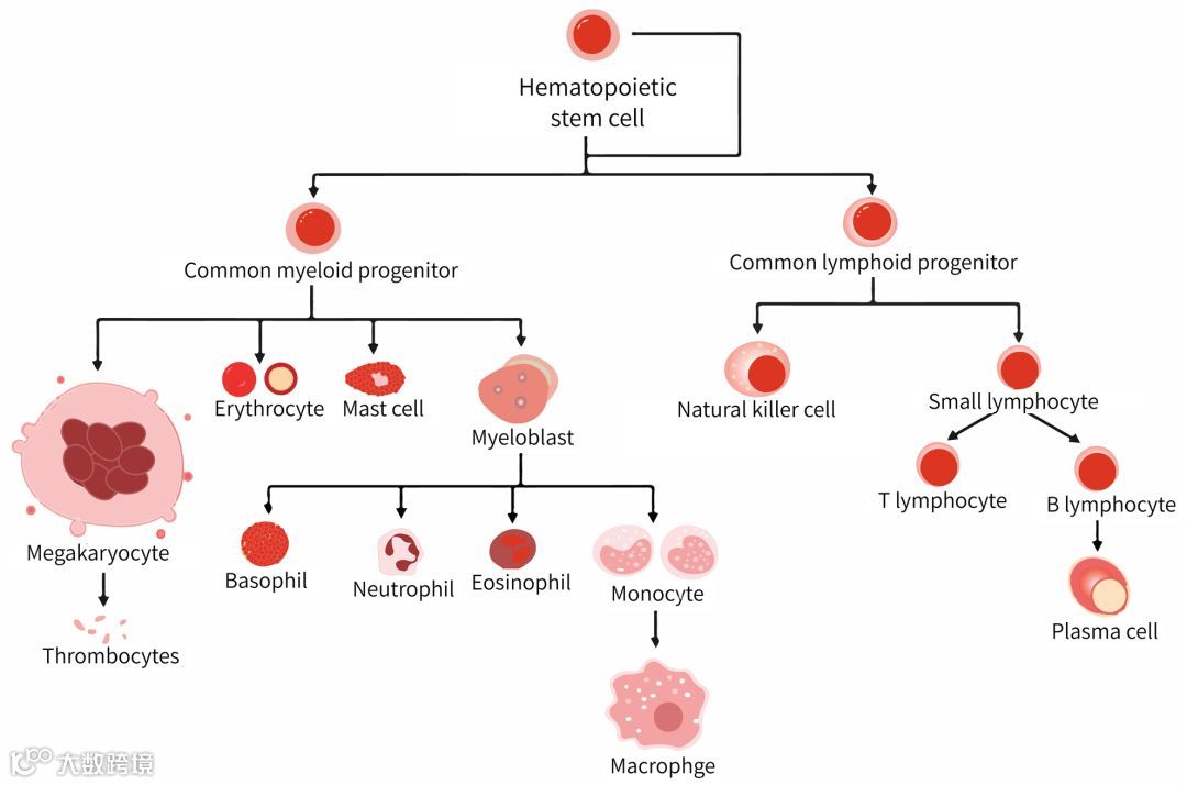 骨髓属于免疫器官。骨髓内有一种很重要的细胞叫做骨髓造血干细胞,具有多种分化潜能,就像一名18岁应征入伍的新兵一样,既可以被培养成通信兵,也可以被训练成炮兵。干细胞可以根据身体需要变成(医学叫分化)红细胞、白细胞、吞噬细胞等等,其中有一部分会变成淋巴干细胞。
