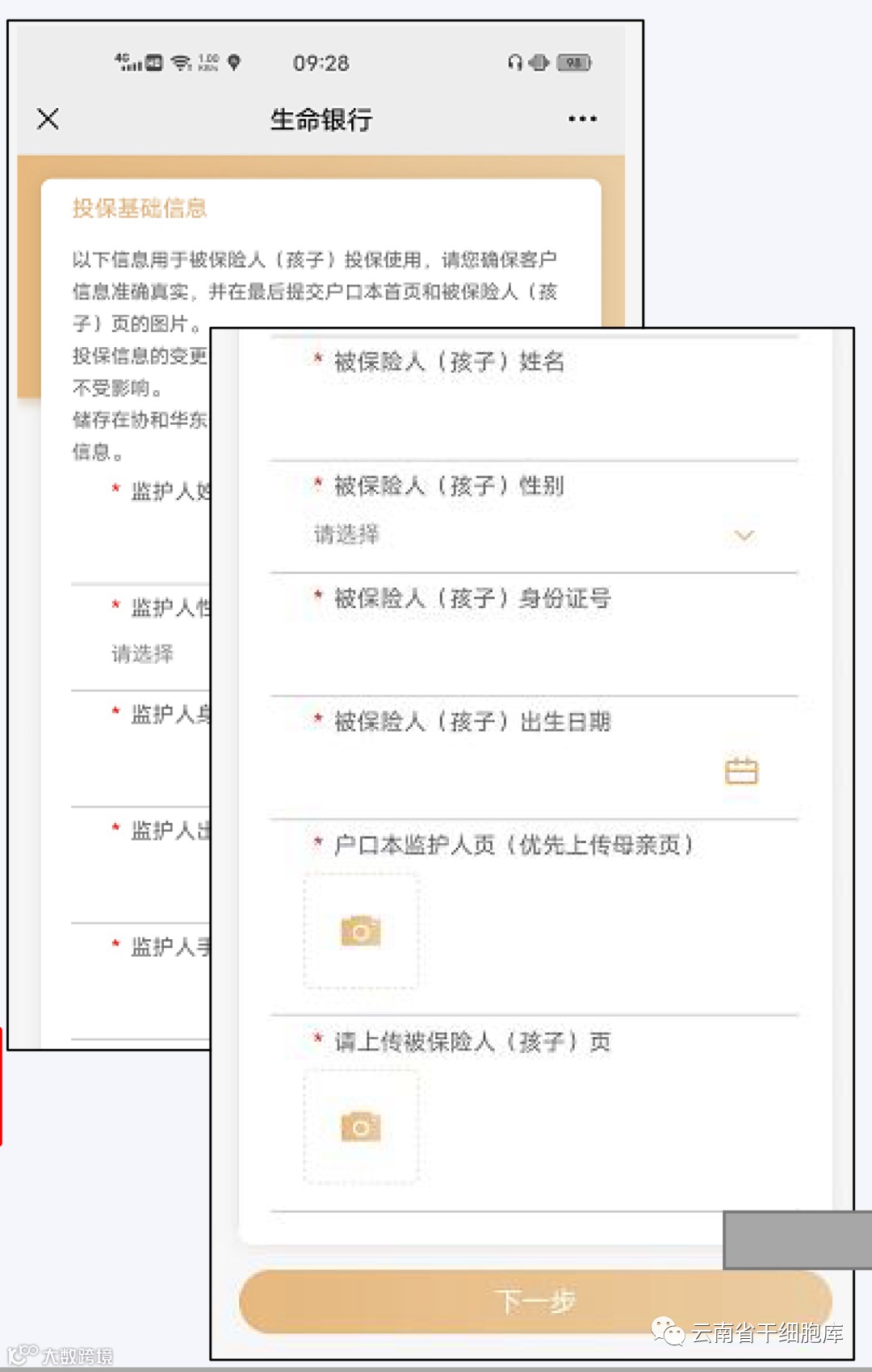 4. 具体收集信息有:监护人姓名、监护人手机号、监护人性别、监护人出生日期、被保险人(孩子)姓名、被保险人(孩子)性别、被保险人(孩子)身份证号、户口本首页(优先母亲的户口页)和被保险人(孩子)页。