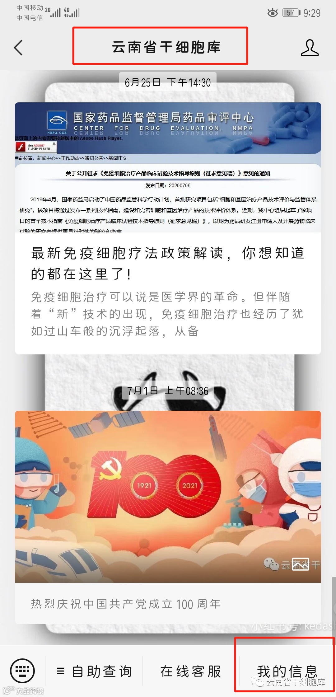 具体操作如下: 1. 关注微信公众号“云南省干细胞库”,点击:“我的信息”——“我的”——“绑定ID”。