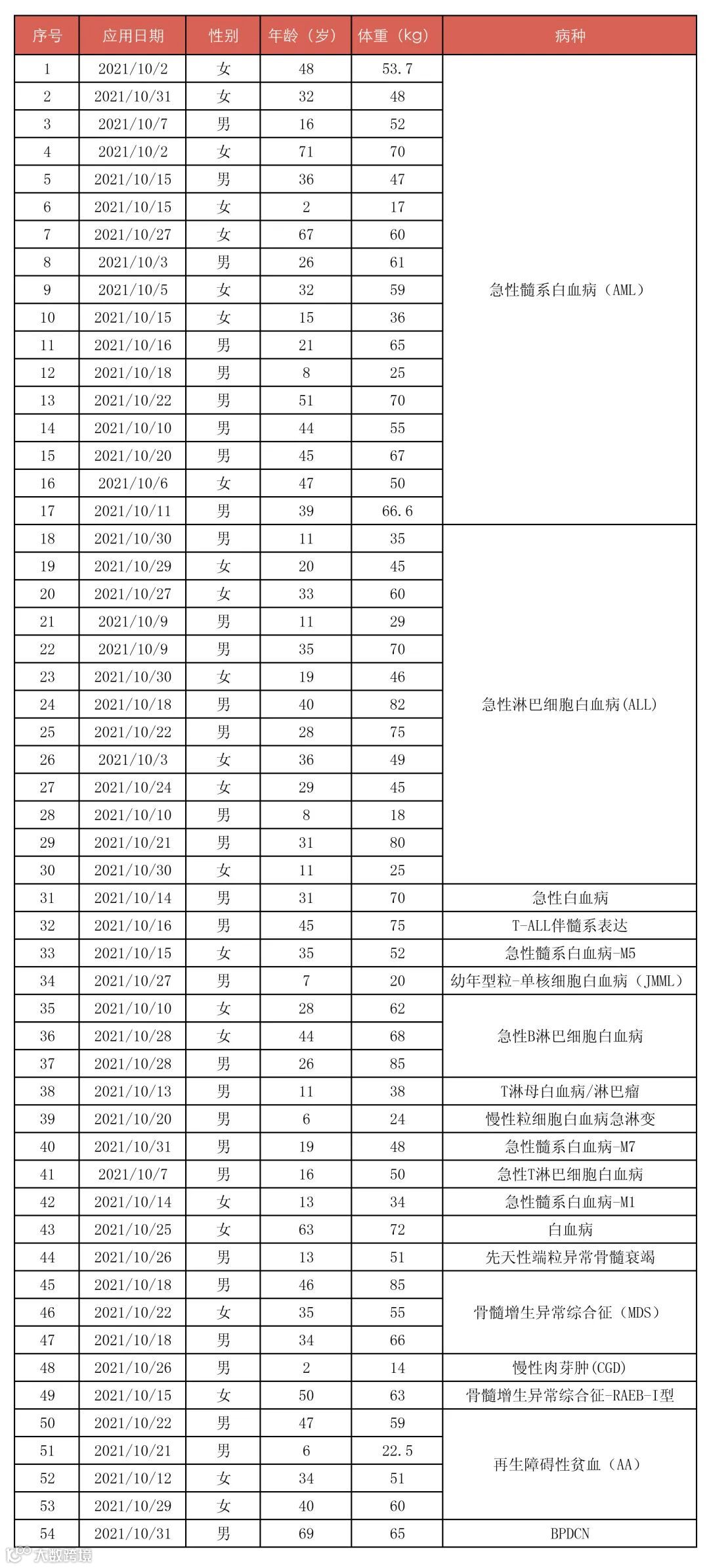 2021年10月,我库为临床提供了54份脐带血造血干细胞用于疾病治疗: