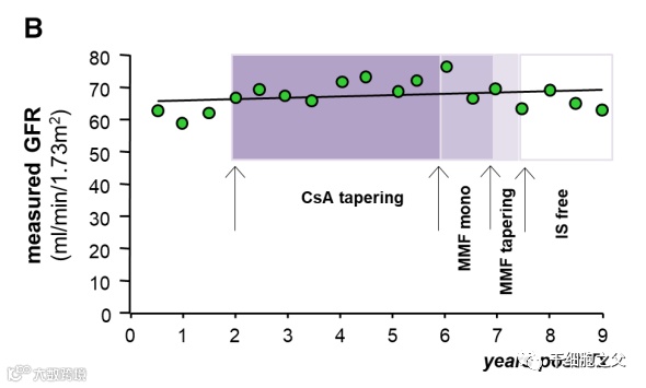 彩色方框突出显示环孢素A (CsA)和霉酚酸酯(MMF)逐渐减少和停用的顺序阶段,在大概五年的时间里逐渐减少,最终完全停止,如箭头所示。