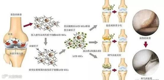 间充质干细胞具有自我分化的功能,在骨关节炎的软骨修复中,间充质干细胞用于向软骨细胞分化的潜能,可以向受损的软组织发生迁移,进而分化成软骨细胞来修复缺损的软骨。