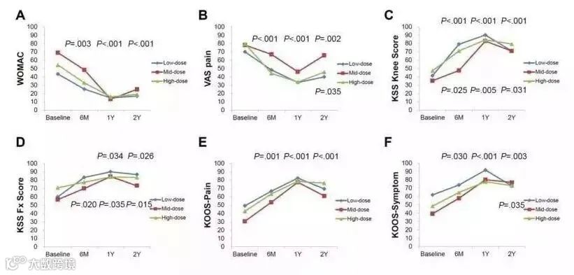 有意思的是,中低剂量组(细胞量:1.0 x 10^7, 5.0 x 10^7)的临床改善在1年后趋于退化,只有高剂量组(细胞量:1.0 x 10^8)在2年内的临床改善有统计学意义。本次研究再次说明:临床结果与注射的脂肪间充质干细胞数量密切相关。