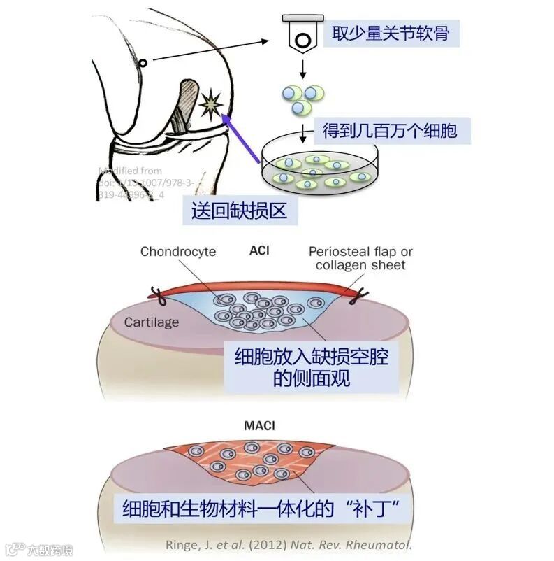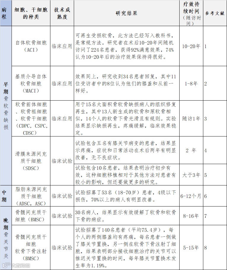 比如,用患者自体脂肪间充质干细胞,通过超声引导的方式进行关节腔穿刺递送,研究结果显示患者疼痛程度和关节功能得到明显改善,没有出现严重的副作用,疗效观察时间为6个月到1年不等。