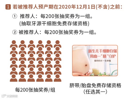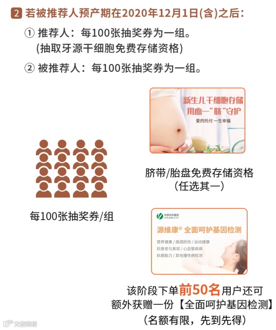 被推荐人:将有机会抽取脐带/胎盘免费存储资格(任选其一),其中被推荐人预产期在2020年12月1日(含)之后的,下单前50名,还可额外获赠一份“全面呵护基因检测”(名额有限,先到先得,详见活动页面)。