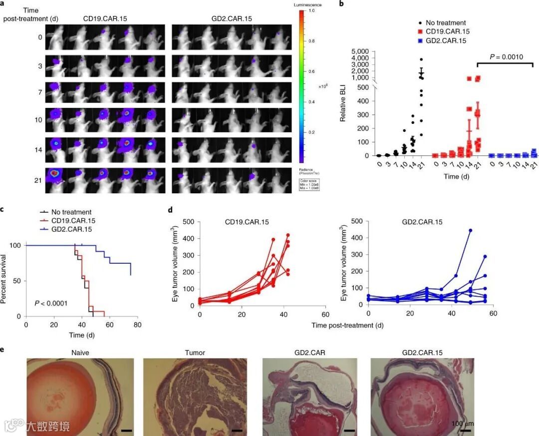 这次他们发现,添加IL-15不会导致使用CD19 CAR-T治疗的小鼠视网膜母细胞瘤消退,但表达IL-15的GD2 CAR-T具有显著改善的抗肿瘤作用,其中60%的治疗组小鼠直到第70天仍保持无瘤。