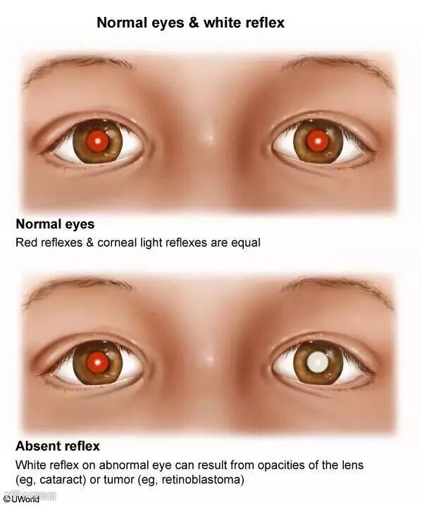 这种疾病通常最早被父母发现,因为患儿大多有白瞳症状(也称猫眼症状)。这主要是因为肿瘤挡住了脉络膜,肿瘤的反光呈白色,因此当使用闪光灯拍摄拍到患儿的眼睛时,患侧眼就会出现瞳孔反光的情况,犹如猫眼,与健侧眼有很大区别。