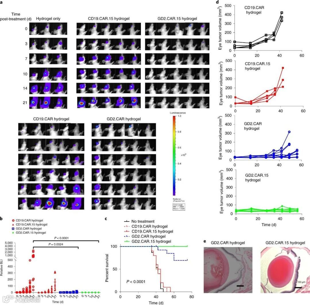 令人惊奇的事发生了,这种水凝胶可显著改善GD2 CAR-T的抗肿瘤作用,不仅可以完全控制肿瘤生长和预防肿瘤复发,还可以改善视网膜的结构恢复。
