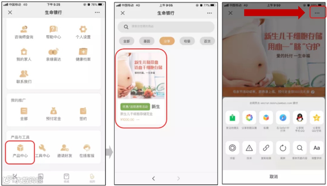 进入“我的”-划到底部“产品与工具”-“产品中心”,选择新生儿干细胞存储产品。点击产品页面右上角“…”按钮,直接分享给好友微信。