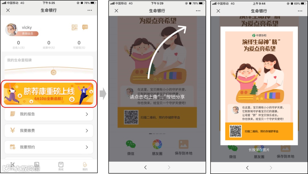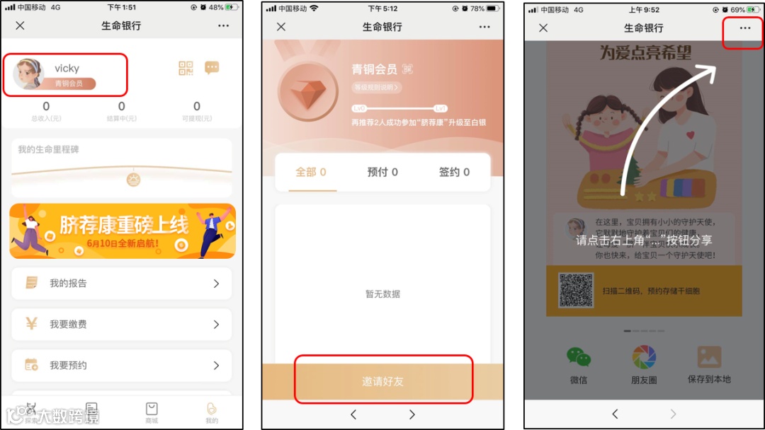 注意的是,在邀请好友之前,一定要先确保自己已经注册并登陆了“中源协和LifeBank”微信公众号哦。一旦注册便自然成为脐荐康会员,享有会员相应的权益,成功推荐好友预付存储定金,即可获得与会员等级相匹配的存储礼金。