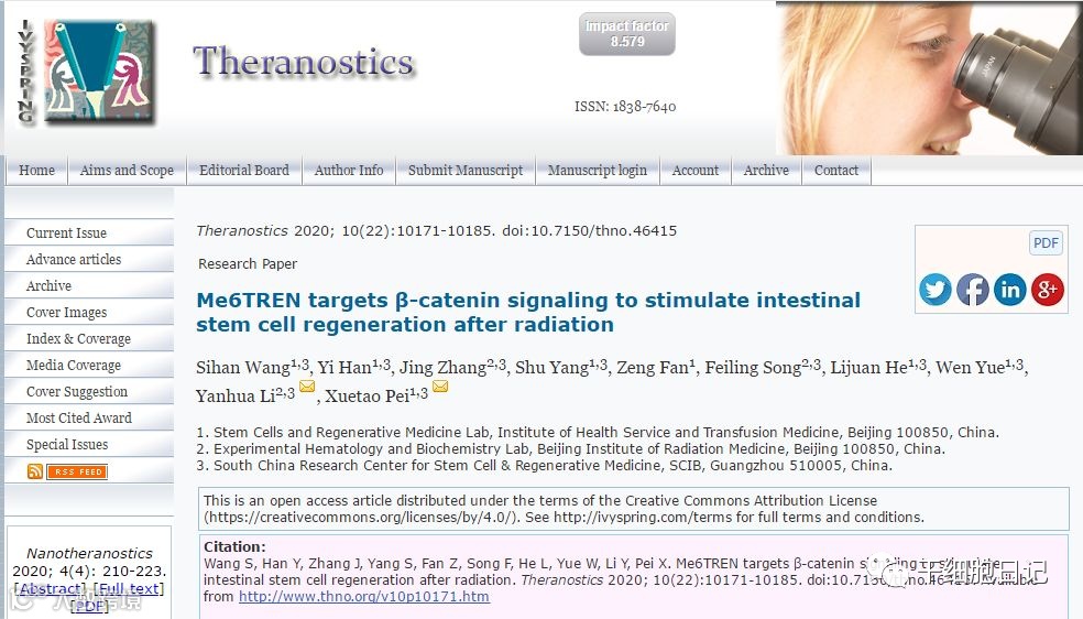 近日,国际学术期刊Theranostics在线发表了军事科学院军事医学研究院和华南干细胞与再生医学研究中心的最新研究成果“Me6TREN targets β-catenin signaling tostimulate intestinal stem cell regeneration after radiation”。裴雪涛教授和李艳华教授为文章共同通讯作者,王思涵博士为第一作者。