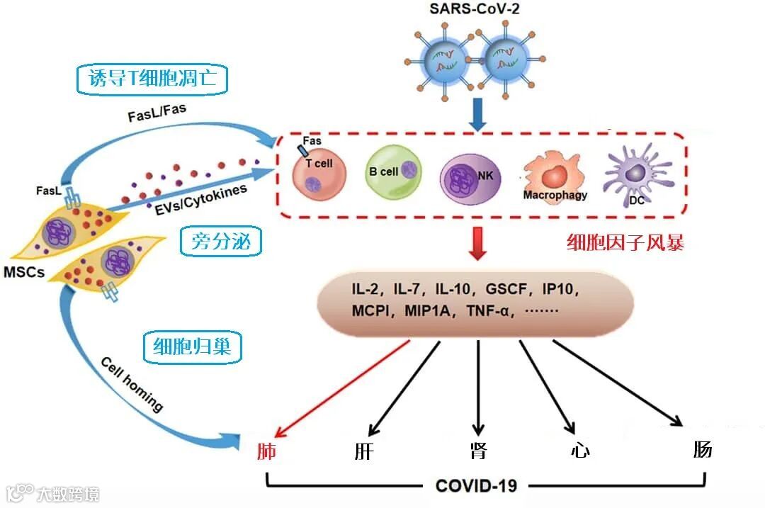 通过诱导T细胞凋亡、分泌外泌体及细胞因子;MSCs 对巨噬细胞、嗜中性粒细胞、NK 细 胞、树突状细胞、T 细胞和 B 细胞进行调控,抑制细胞因子风暴。