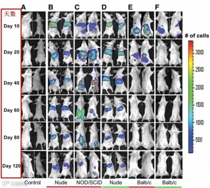 MSC腹腔注射免疫缺陷的小鼠(裸鼠和NOD/SCID小鼠)后,在体内多组织器官中存在可达120天,而MSC在免疫系统健全的异品种小鼠只能存在20多天,但是可以在同品种小鼠中存在40多天(见图)[7]。