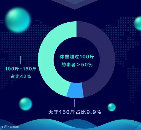 “体重超过100斤的患者超50%。其中100斤-150斤的大体重患者共975例,总占比42%,而大于150斤的患者231例,占比9.9%,而体重最大患者118公斤。”