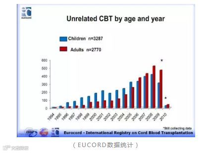 欧洲脐带血移植中心(EUCORD)的数据亦显示近年成人脐带血移植逐渐上升,2008年后每年移植的例数甚至超过了儿童移植。
