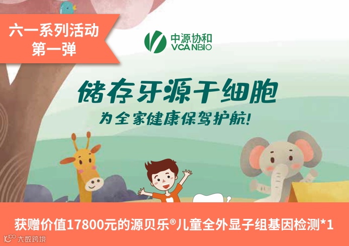 活动内容:活动期间,在线支付定金(12000元)或全款(28800元)购买牙源干细胞存储产品20年期,赠送价值17800元 的源贝乐®儿童全外显子组基因检测*1。
