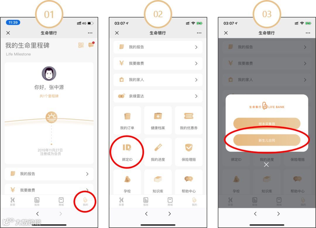 进入“我的”页面,向下滑动页面,点击“绑定ID”,选择“新生儿合同”。(在绑定前,一定要先注册生命银行微信公众号)